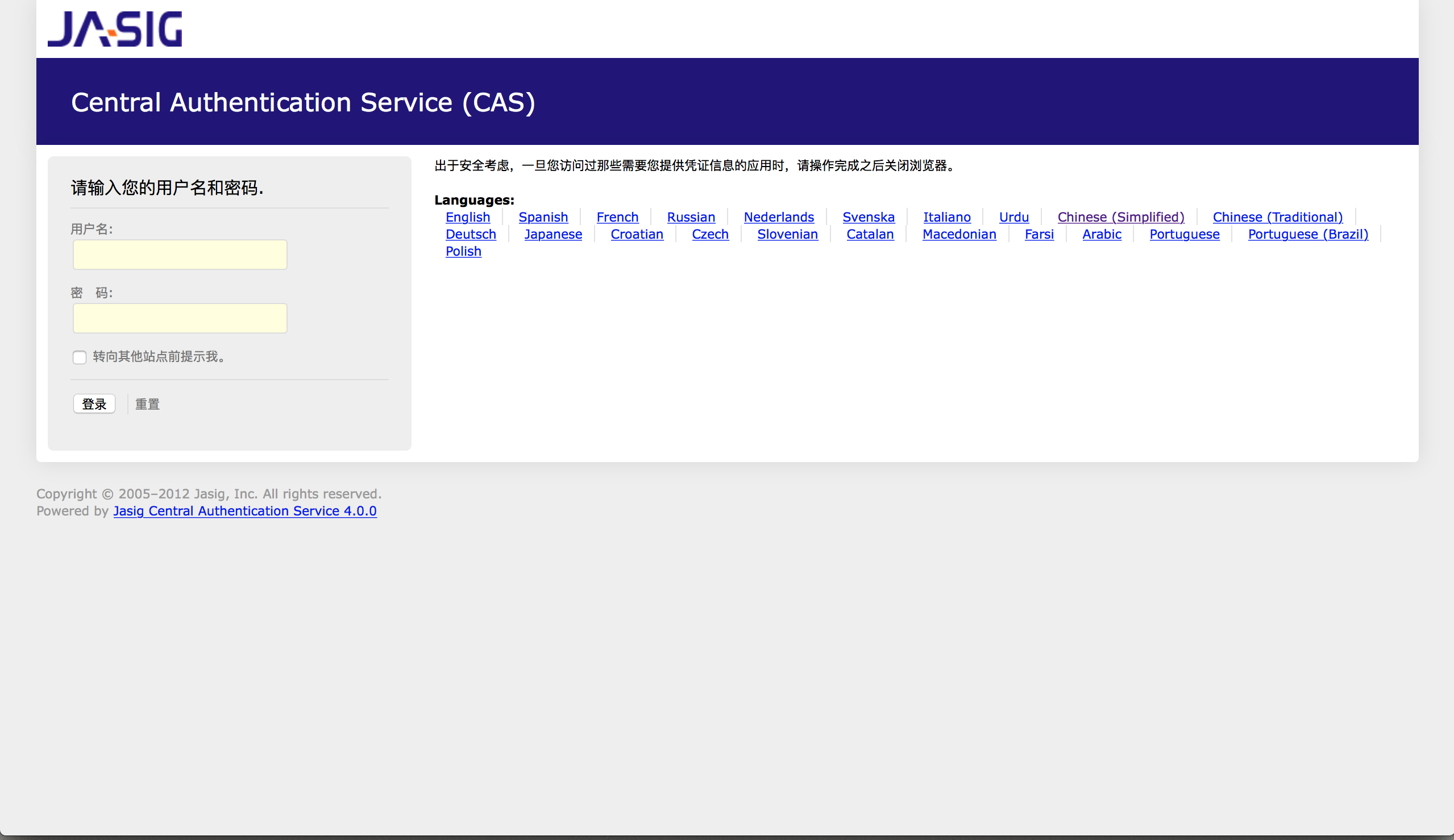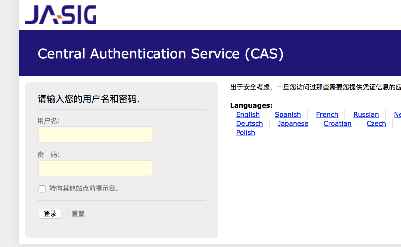 重启tomcat,报错消失,还有几个没有什么卵用的报错暂时忽略,访问:https://cas.changg-1991.com:8443/cas/login?locale=zh_CN