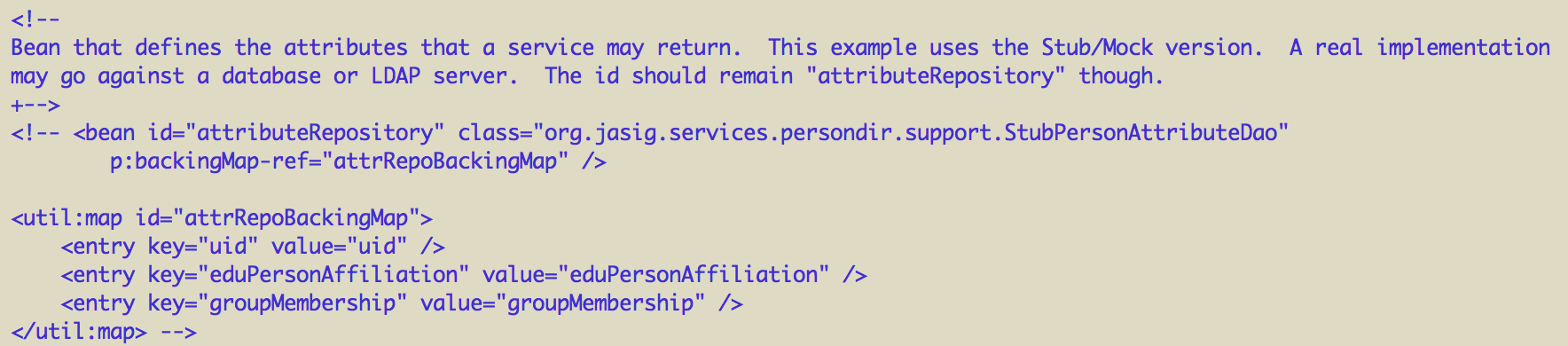 14<bean class="org.jasig.services.persondir.support.jdbc.SingleRowJdbcPersonAttributeDao" id="attributeRepository">