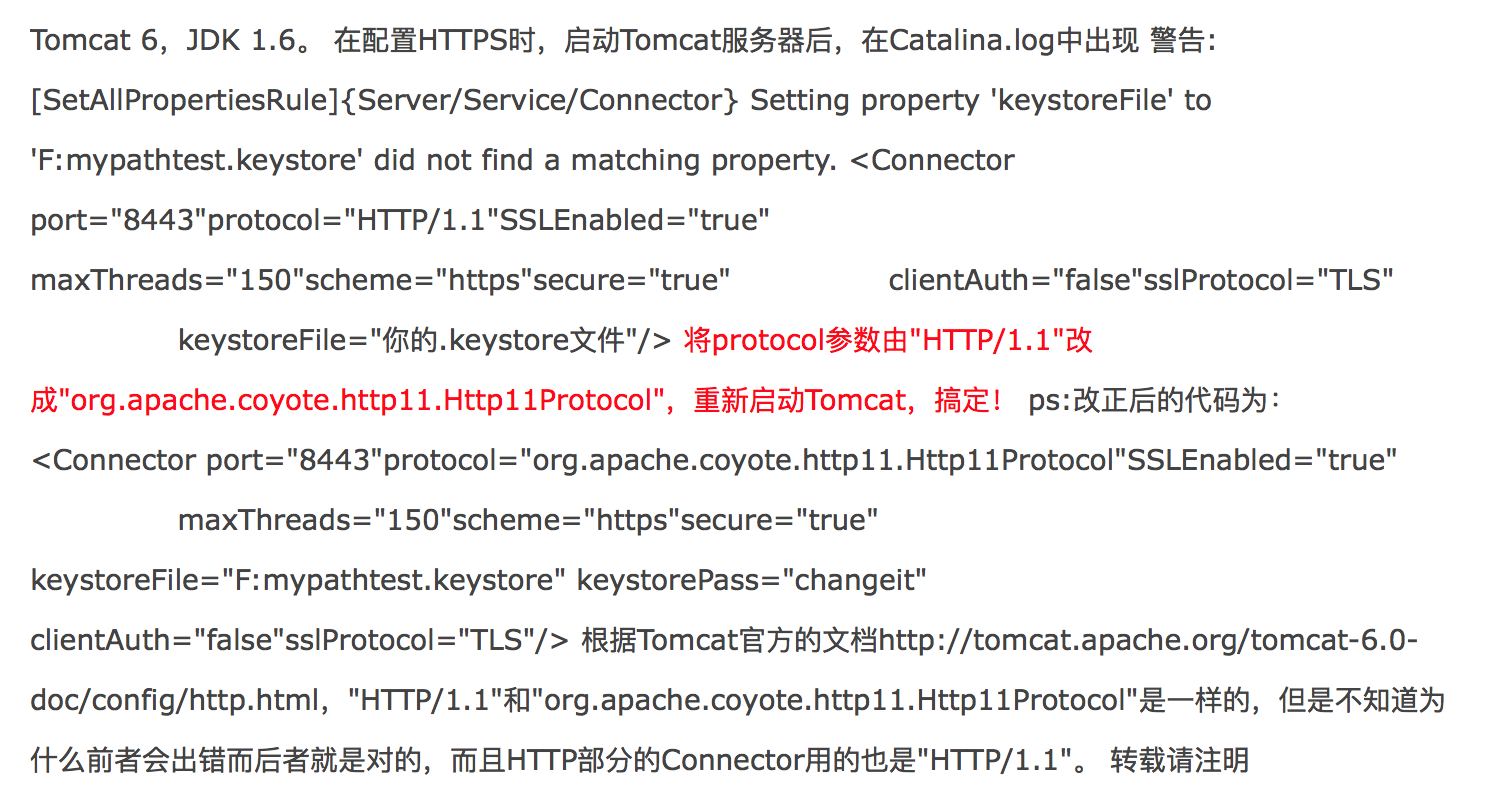 查了半天,原来是修改server.xml中SSL的属性protocol为org.apache.coyote.http11.Http11Protocol,参考