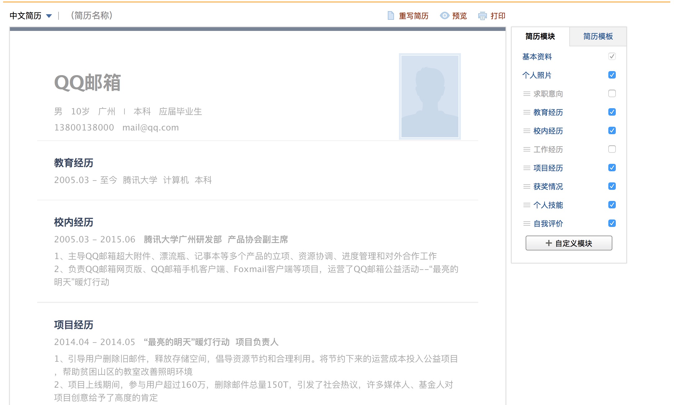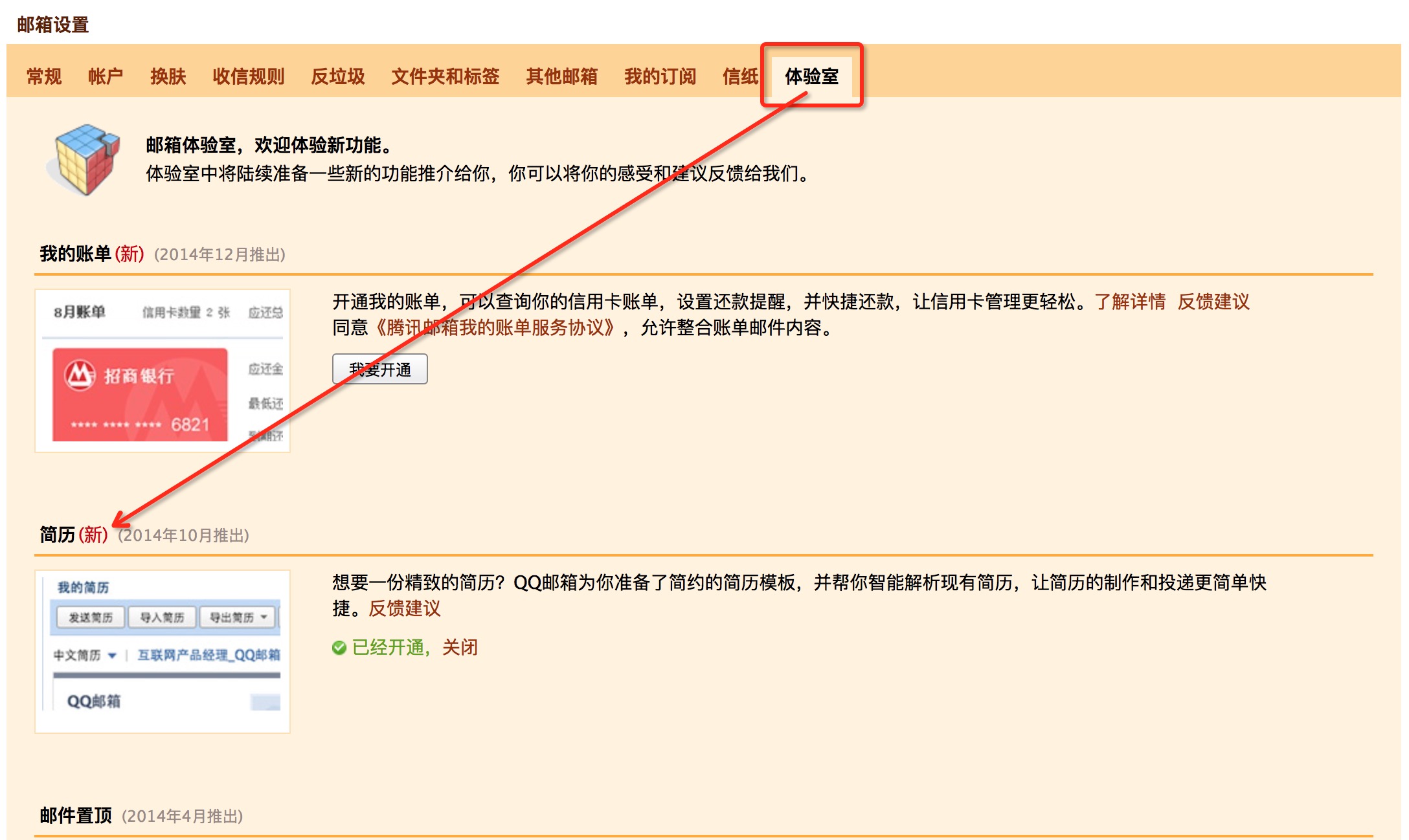 关于简历模板直接给大家一个傻瓜暴力的方法:用QQ邮箱的简历功能。打开QQ邮箱设置->体验室->简历,将其开通就OK。